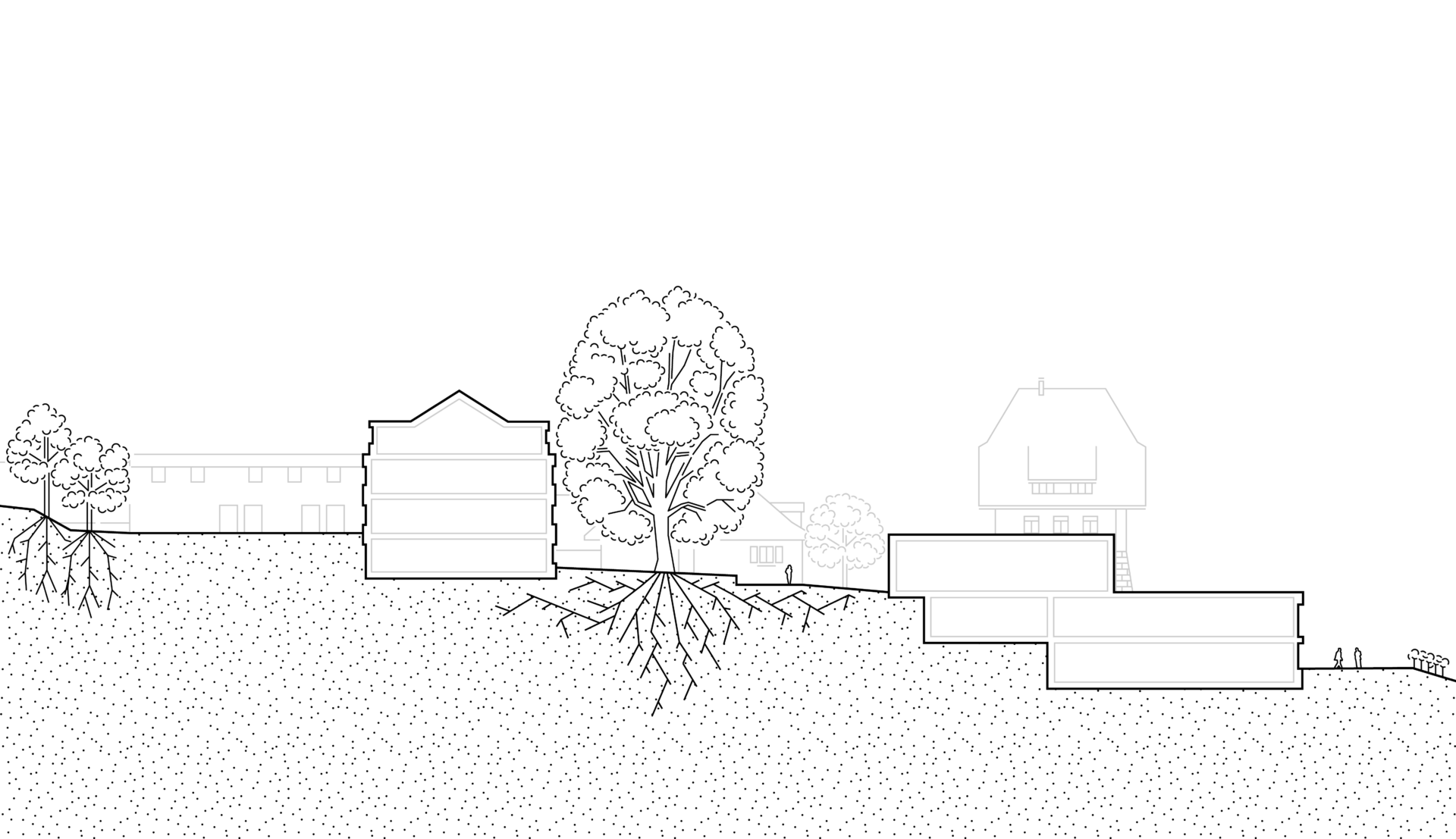 The transversal axis aligns with the “village-street” typology of the Tschugg commune. It is consolidated into a “spinal column” leading to the main buildings of the hospital campus.