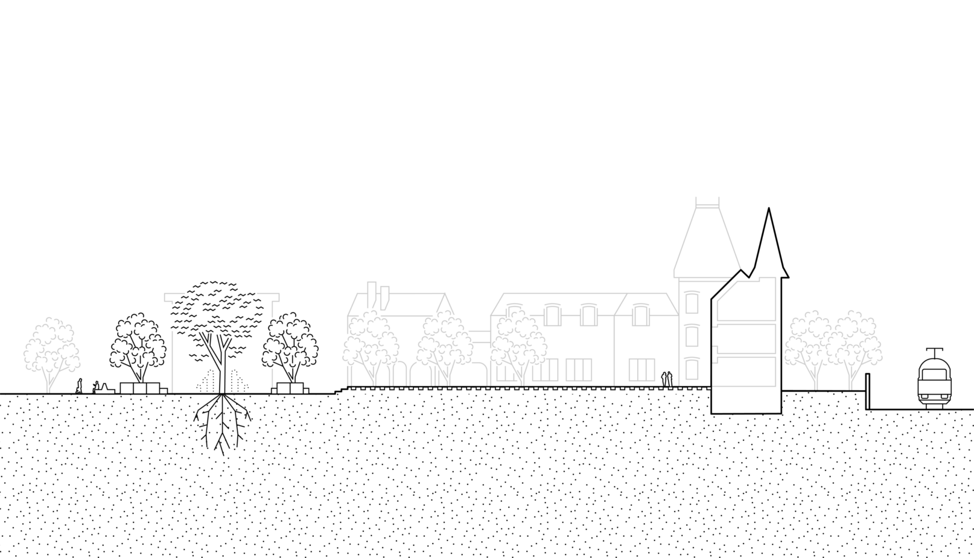 Face au réchauffement climatique, le projet mise sur les ressources naturelles Eau–Sol–Végétal pour réduire les îlots de chaleur. La nouvelle canopée d’arbres majeurs offre ombrage et confort thermique, tandis que des surfaces perméables, des noues paysagères et un enrobé drainant dirigent l’eau vers les racines. Ces dispositifs transforment la place en un véritable système de rafraîchissement naturel : infiltration, évapotranspiration, jardins de pluie et continuités végétales redonnent de la résilience au cœur de ville.